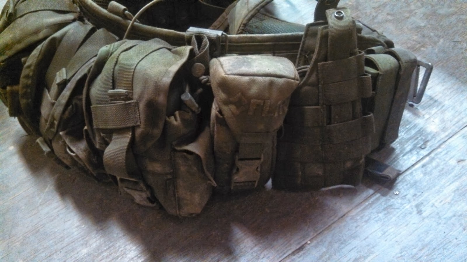 1) Magazine pouches for 9 mags. 3 are in open topped pouches for ready access, then the pouches with flaps contain up to another 6 magazines. I did this by attaching the 6 mag pouch to the molle on the outside of a triple stacker open top pouch. This combination allows a decent mag load but takes care of the frequent disadvantage of belt rigs in that mag access is sometimes slower in pouches than in open topped pouches such as on a PC. Best of both worlds here.